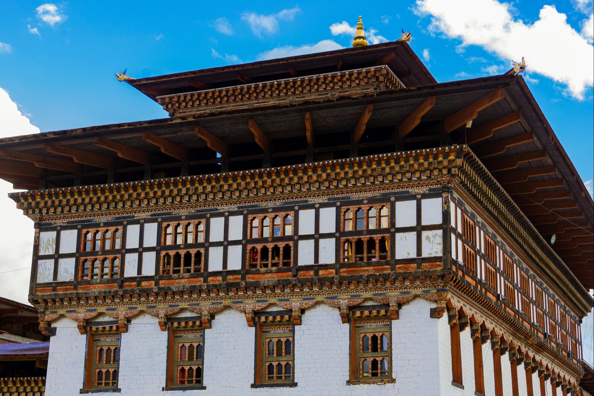 The structure features massive whitewashed stone walls, large courtyards enclosed by monastic and administrative buildings, golden tiered roofs and intricately carved wooden windows. At the centre rises the utse, the central tower that houses some of the dzong’s most sacred temples.